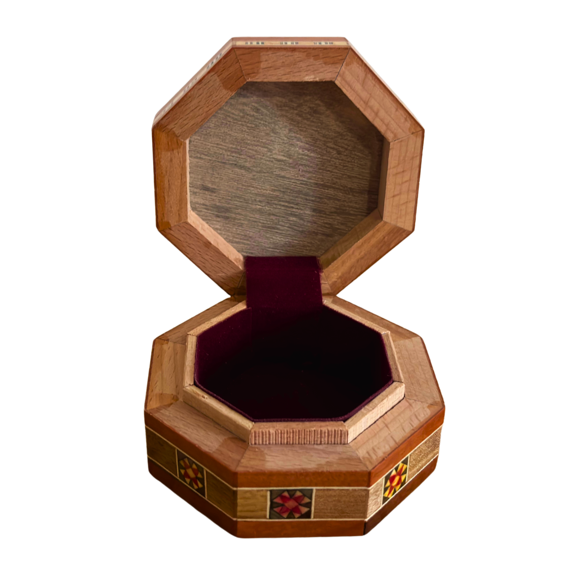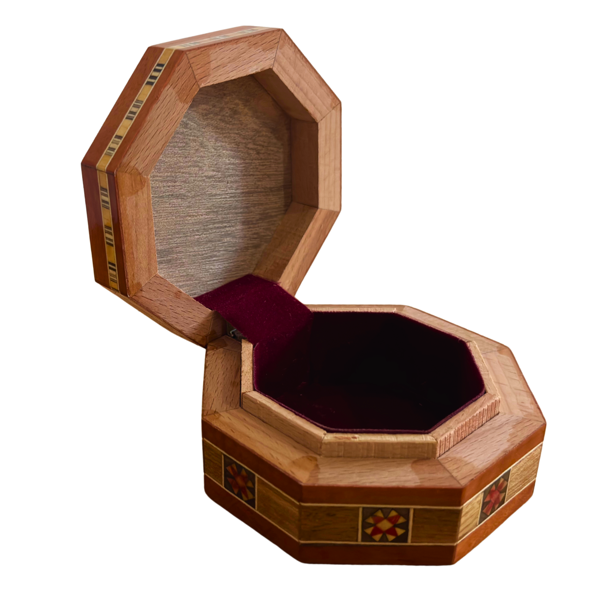 octagonal jewelry box, Damascene mosaic keepsake, mother of pearl inlay box, walnut wood octagonal box, handcrafted small jewelry chest, Middle Eastern mosaic art, artisanal gift box, unique vintage-style box, handcrafted wood gift, elegant keepsake box, Damascus box, Syrian box, gift for her, gift for him