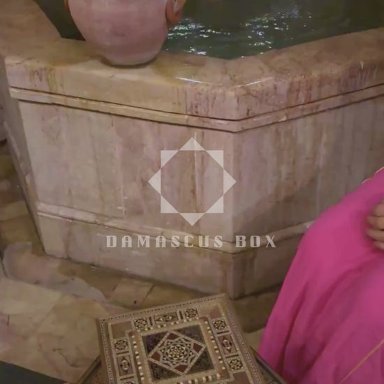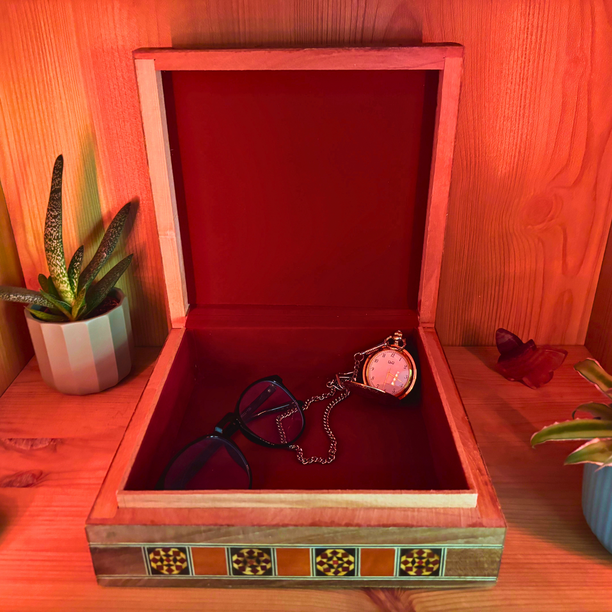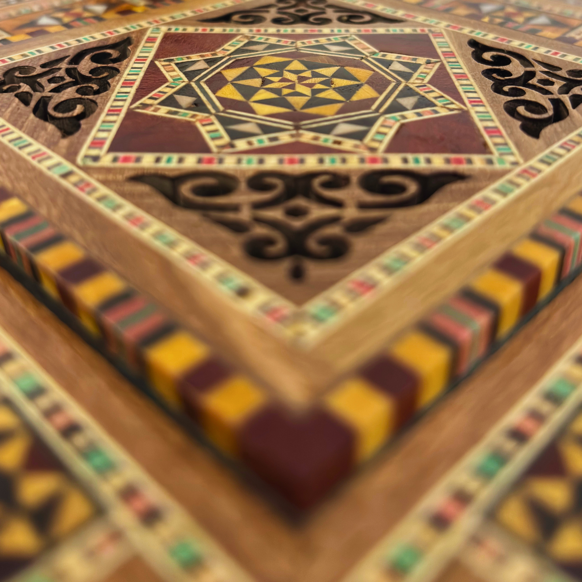 Cette élégante boîte rectangulaire en mosaïque est soigneusement fabriquée à la main à partir de hêtre, noyer et bois de citron, mettant en valeur un travail d’artisanat damascène délicat. Son design sophistiqué offre une solution belle et pratique pour ranger bijoux, montres, cigares ou précieux souvenirs.