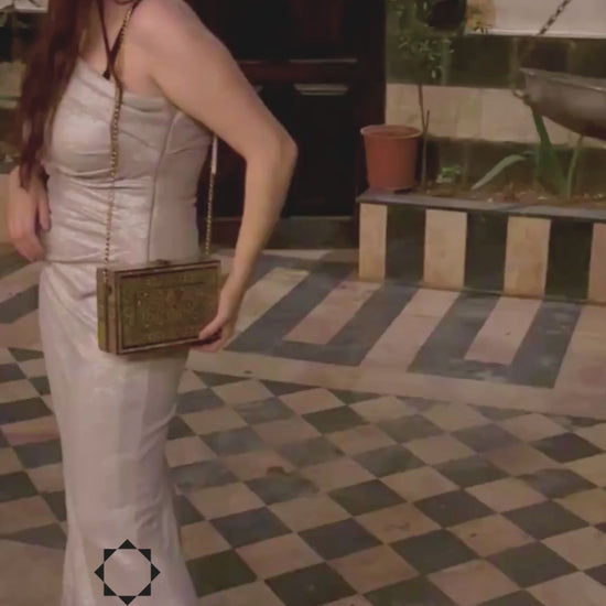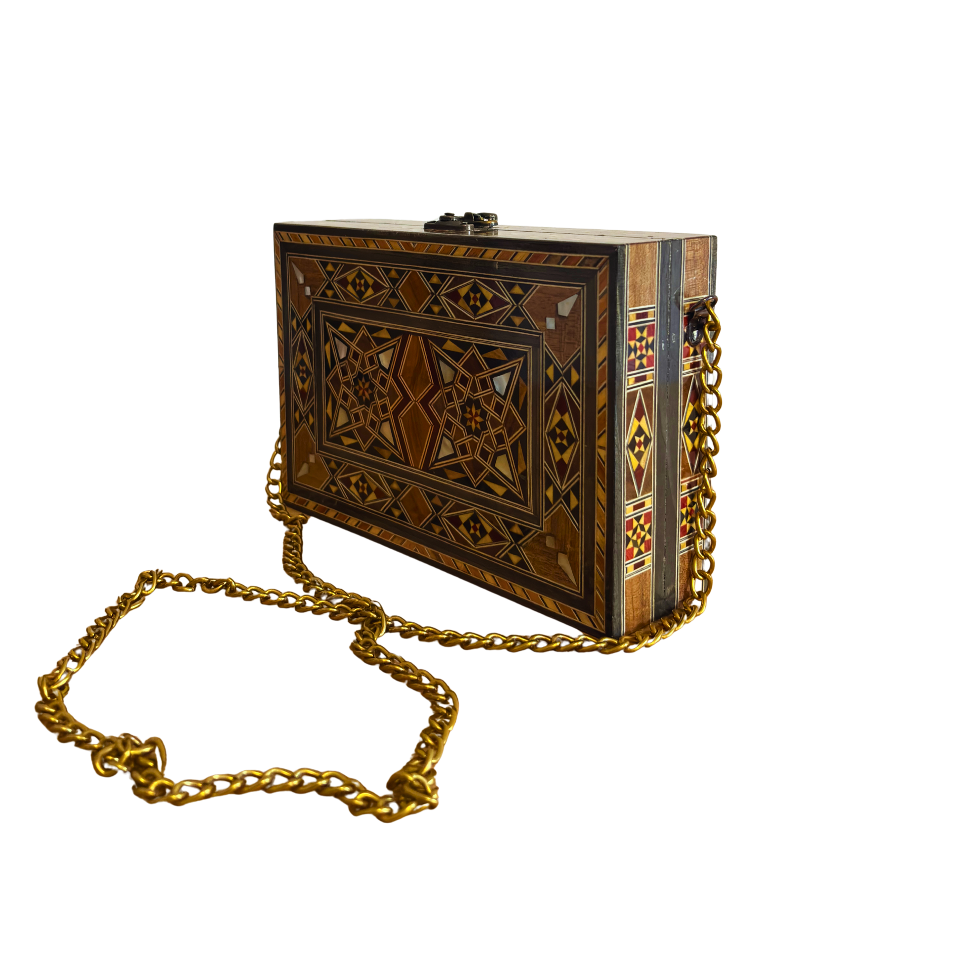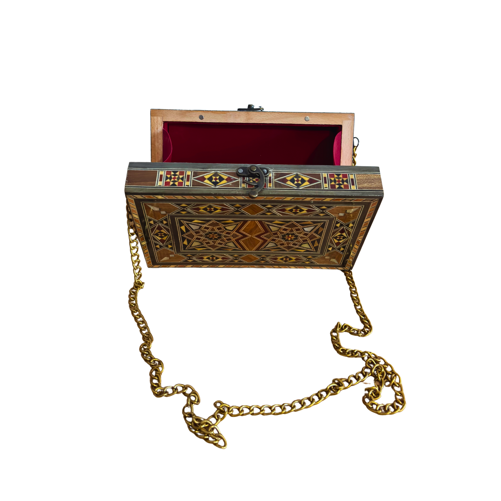 Damascener handtas, parelmoer, mozaïek hout, Syrisch vakmanschap, luxe avondtas, oosterse kunst, gouden ketting, Damascus Box