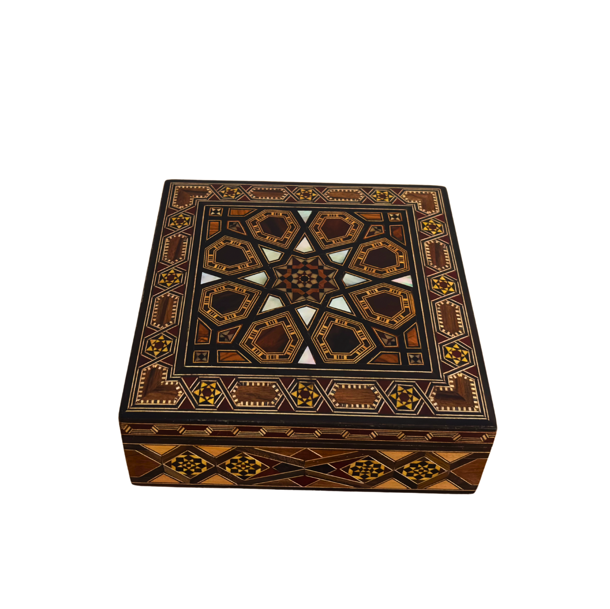 Met de hand vervaardigd uit walnoot-, rozen-, eucalyptus-, beuken- en citroenhout, en ingelegd met authentiek parelmoer, is deze doos een toonbeeld van Syrische kunst.