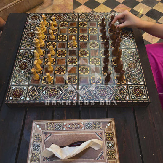 mesa damasquina, xadrez e backgammon, Gaby Al Dayeh, madrepérola, artesanato sírio, arte oriental, mesa de jogos de luxo, peças incluídas, conjunto completo