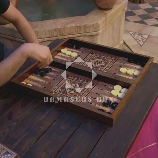 mesa damasquina, xadrez e backgammon, Gaby Al Dayeh, artesanato sírio, arte oriental, conjunto de luxo, design clássico, peças incluídas