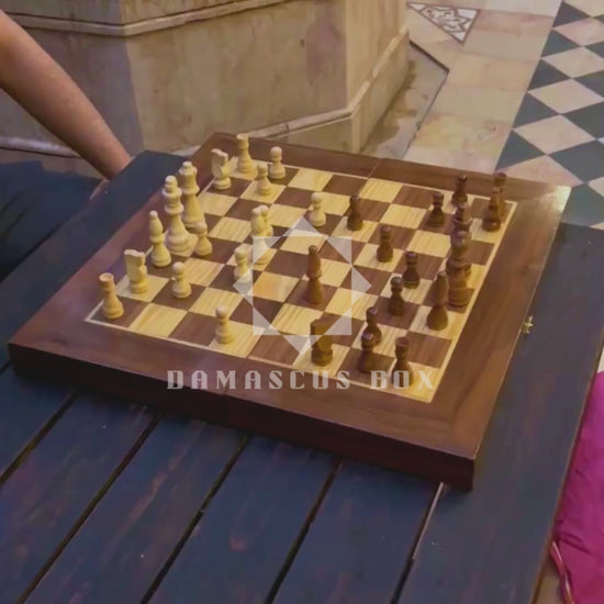 A superfície exterior exibe um tabuleiro clássico de xadrez, enquanto o interior revela um mosaico damasquino, refletindo séculos de herança artística.