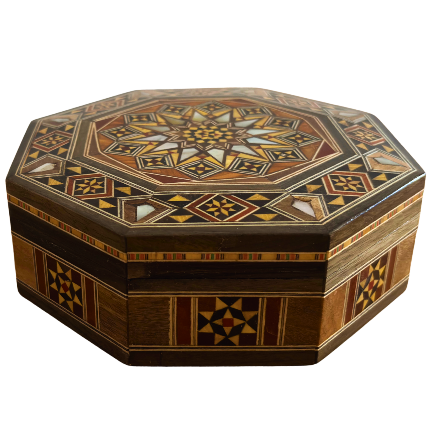 Elegante caixa octogonal de mosaico damasceno – Artesanal em madeira com incrustação de madrepérola