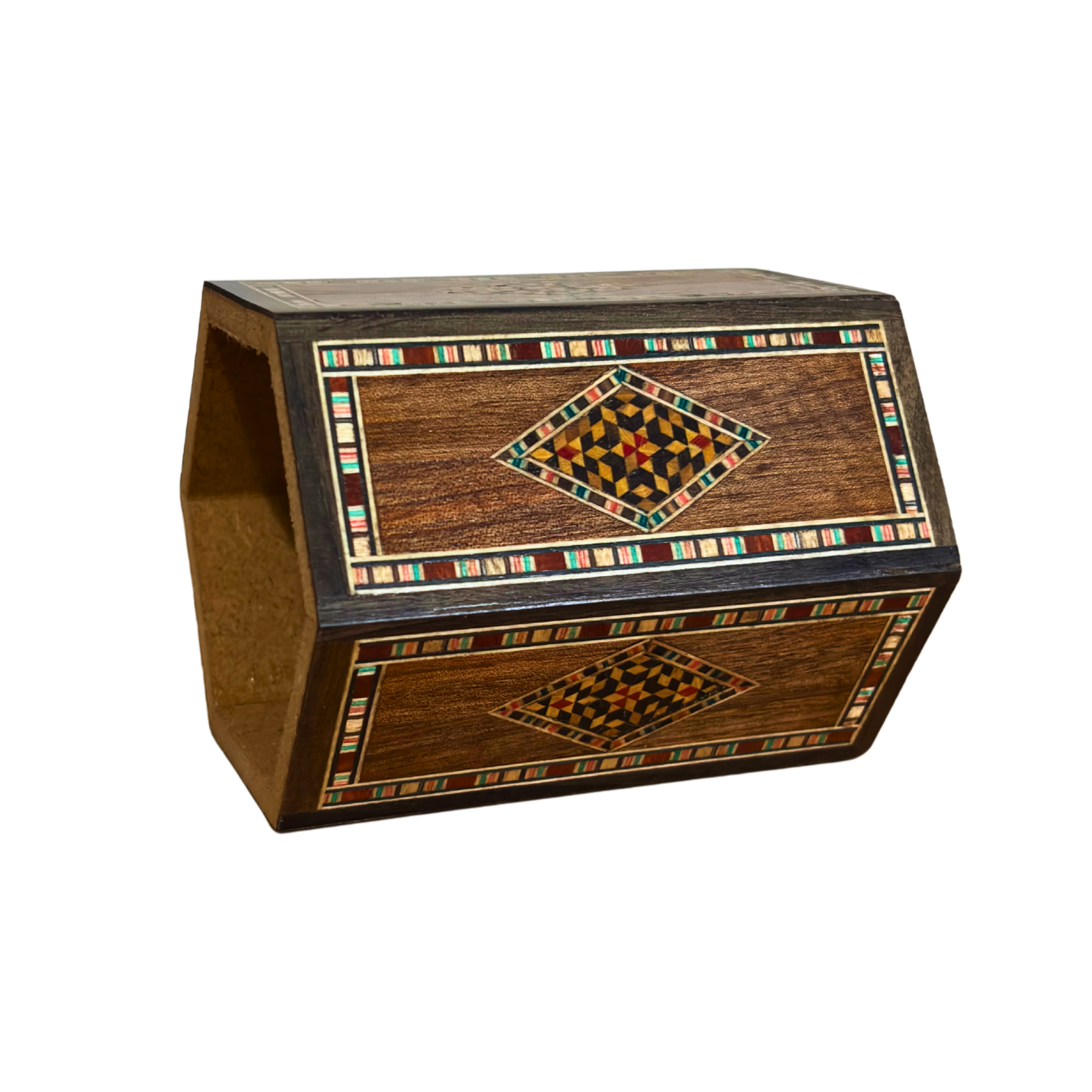suporte de canetas damasquino, design em mosaico, madeira artesanal, arte síria, Gaby Al Dayeh, decoração oriental, Damascus Box